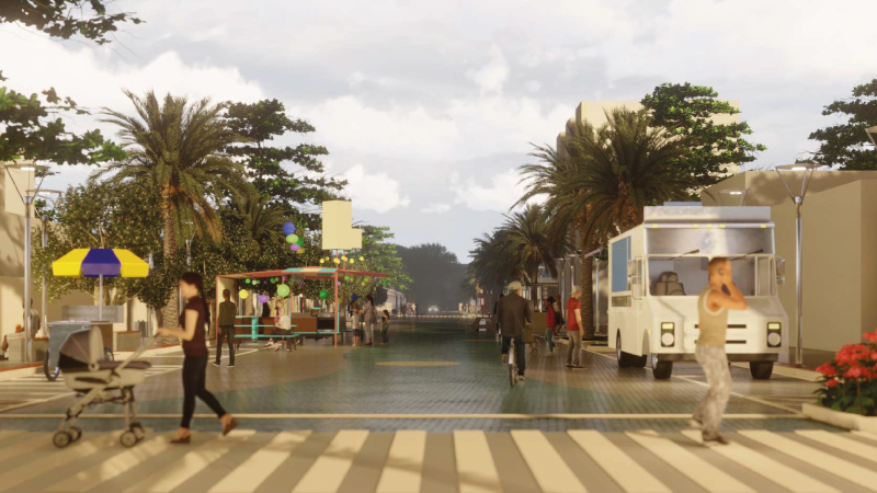 O projeto propôs a instalação de pisos elevados e coloridos, urbanização com canteiros, bancos e um novo paisagismo. As faixas de calçadas laterais foram ampliadas para acolher os pedestres e melhorar a mobilidade urbana.
